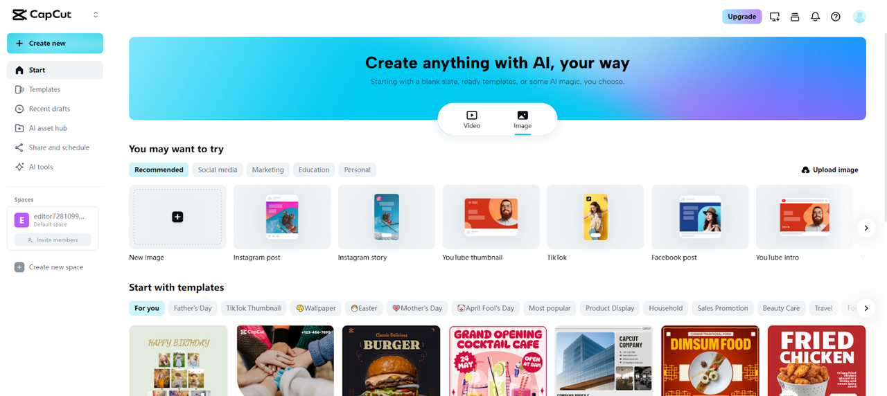 Step 1: Open your editor and upload your photo Log in CapCut and then select “Image” from the main menu. Next click on “New image”.