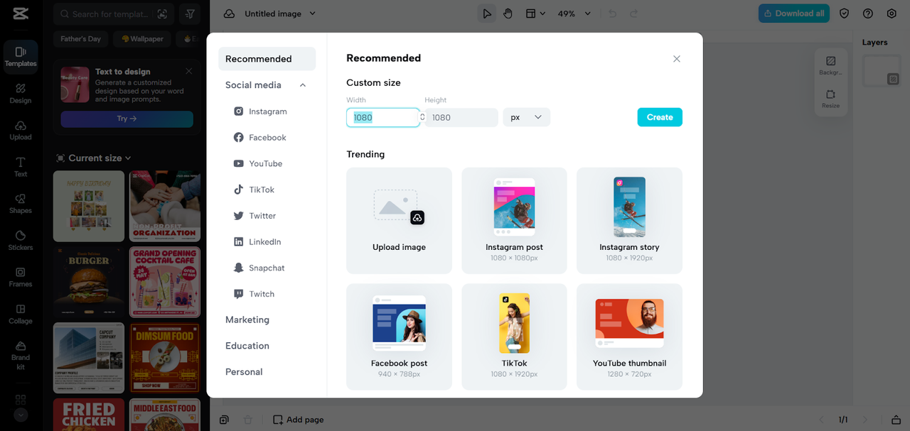 This will direct you to CapCut web main image editing interface. A window appears letting you set the image size. Choose from preset sizes or enter your own. Then upload a photo from your local device, Cloud, Google Drive, or Dropbox. If you don’t have a photo, pick one from templates to begin.